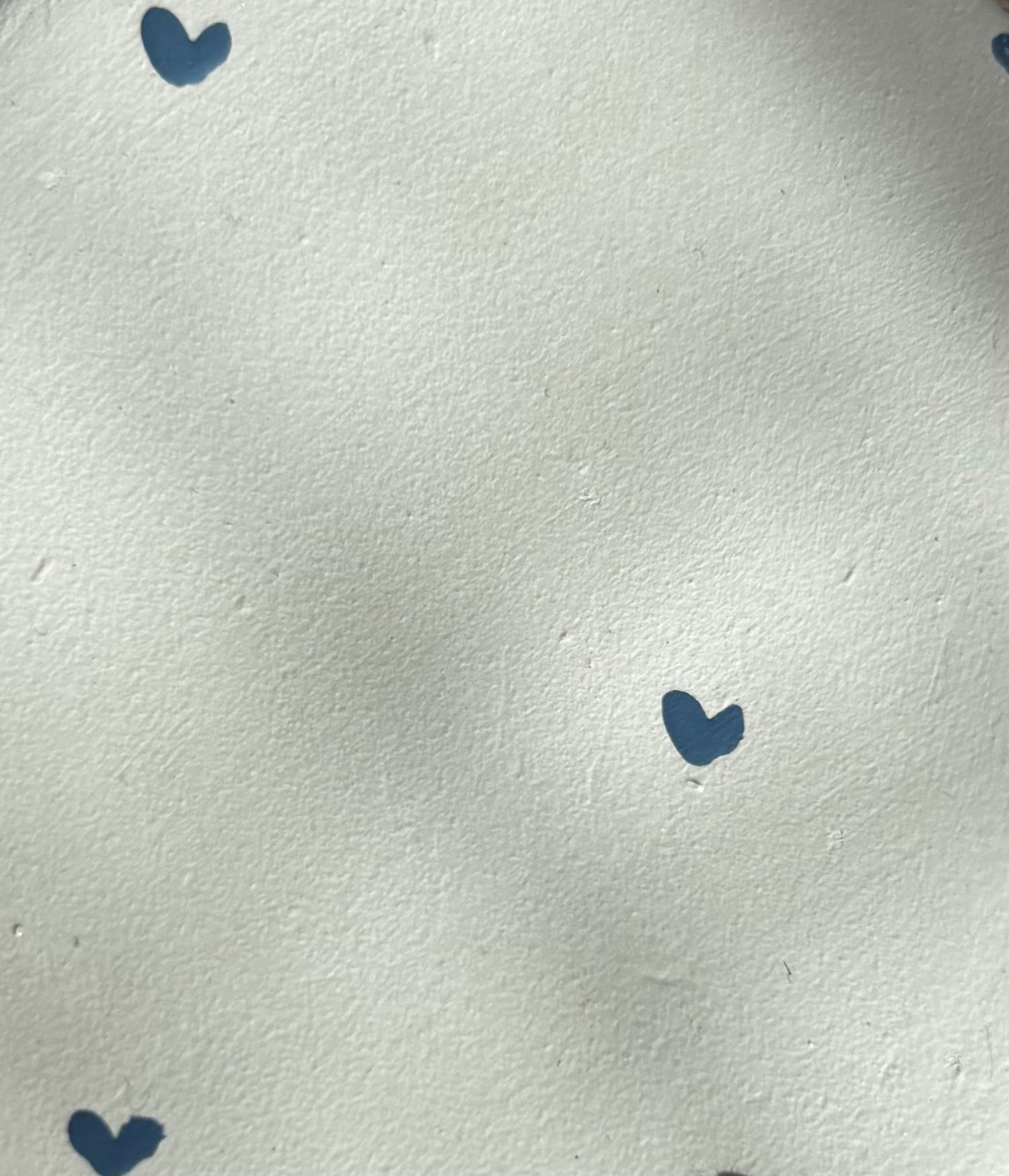 De petits cœurs peints à la main, en teinte bleu minéral, viennent ponctuer la création avec délicatesse.